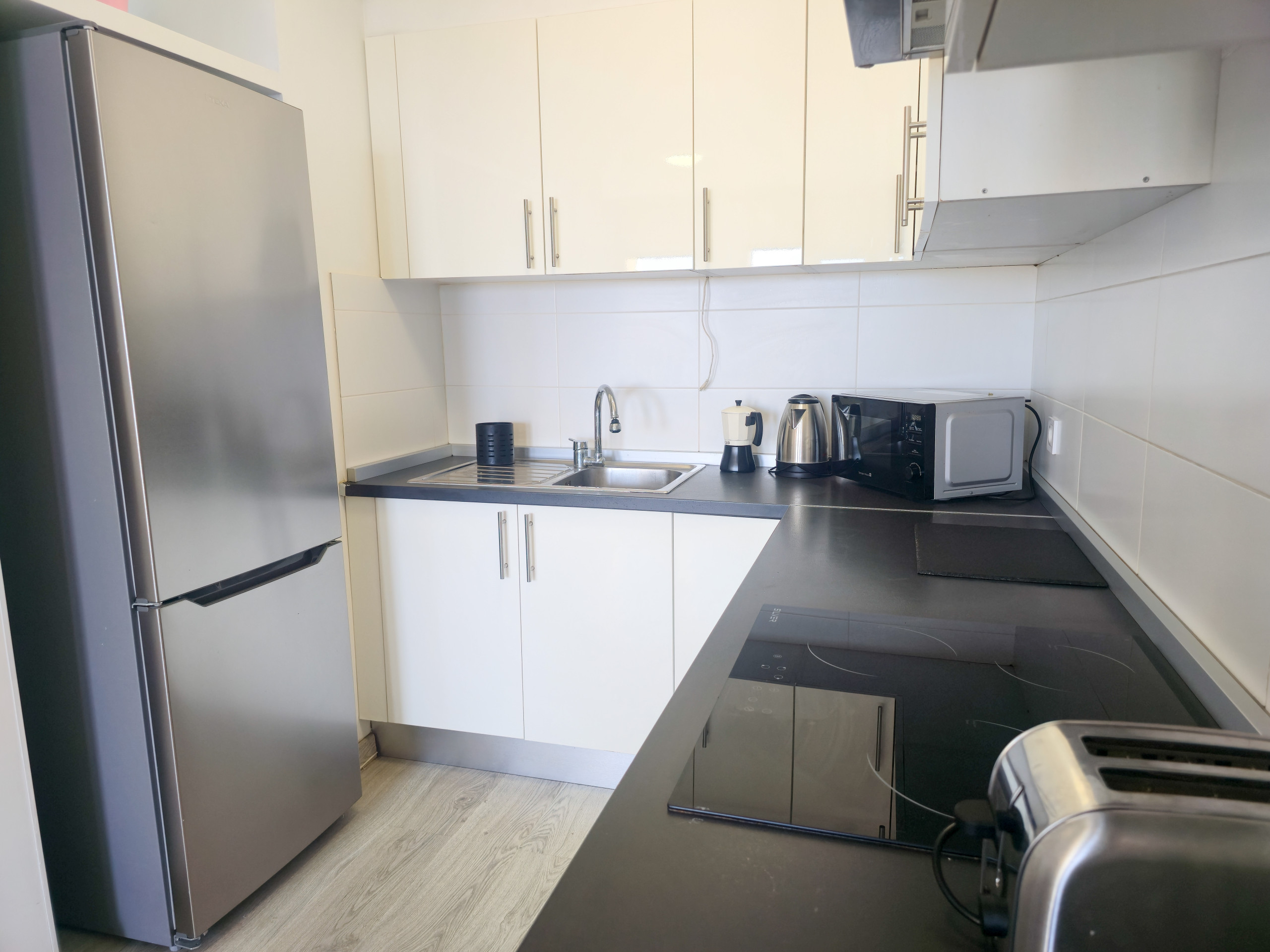 La cocina, abierta al salón, está completamente equipada con electrodomésticos modernos como nevera, lavadora, horno, microondas, cafetera, tostadora y hervidor. Podrás preparar deliciosas cenas románticas con todos los utensilios necesarios a tu disposición.