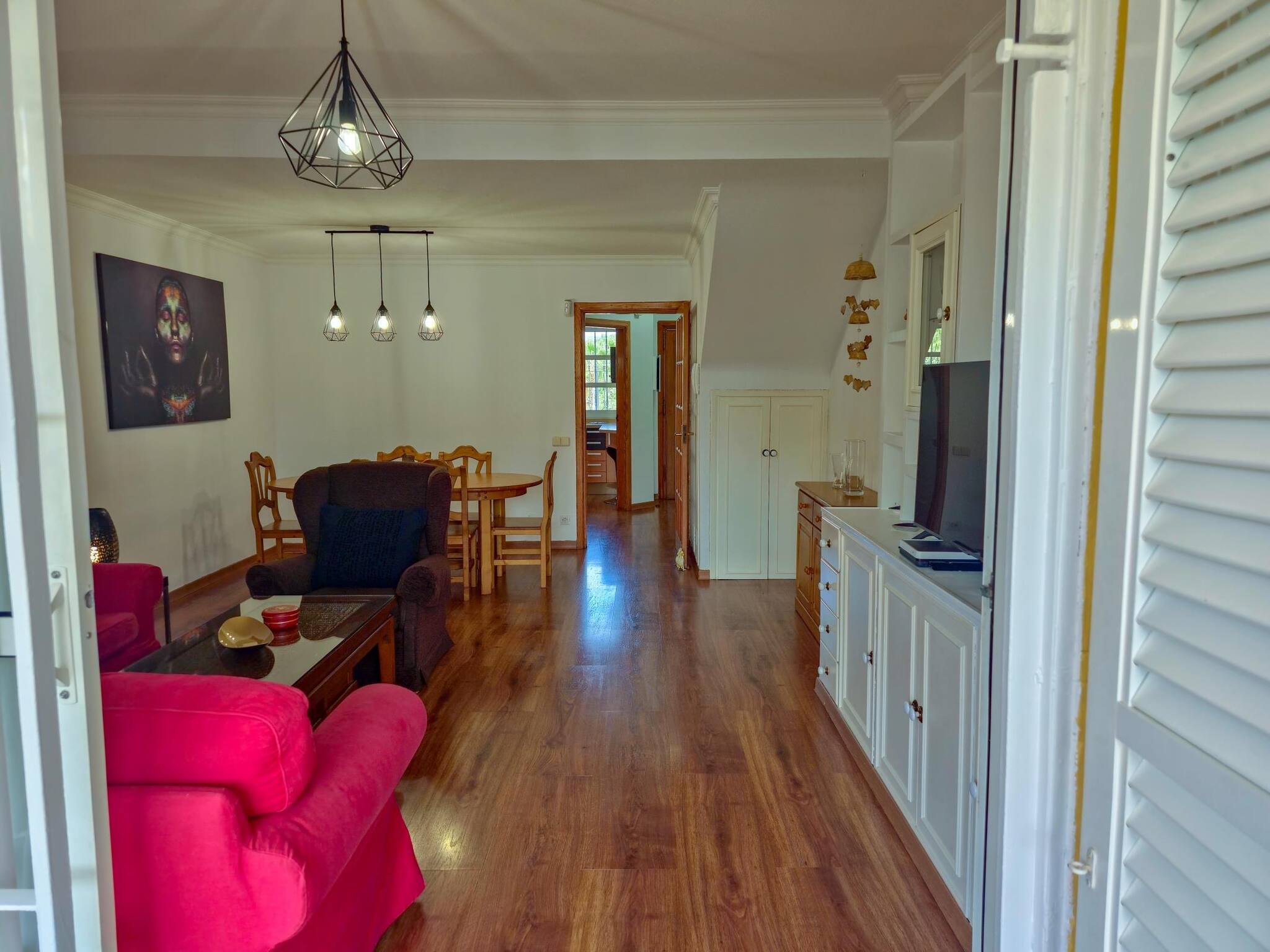 Es una casa de 3 plantas. En la primera planta hay una cocina, completamente equipada y con lavavajillas. Un amplio salón con zona de estar y zona de comedor, con acceso a una preciosa terraza, con vista al jardín y a la piscina del complejo. También hay un aseo.