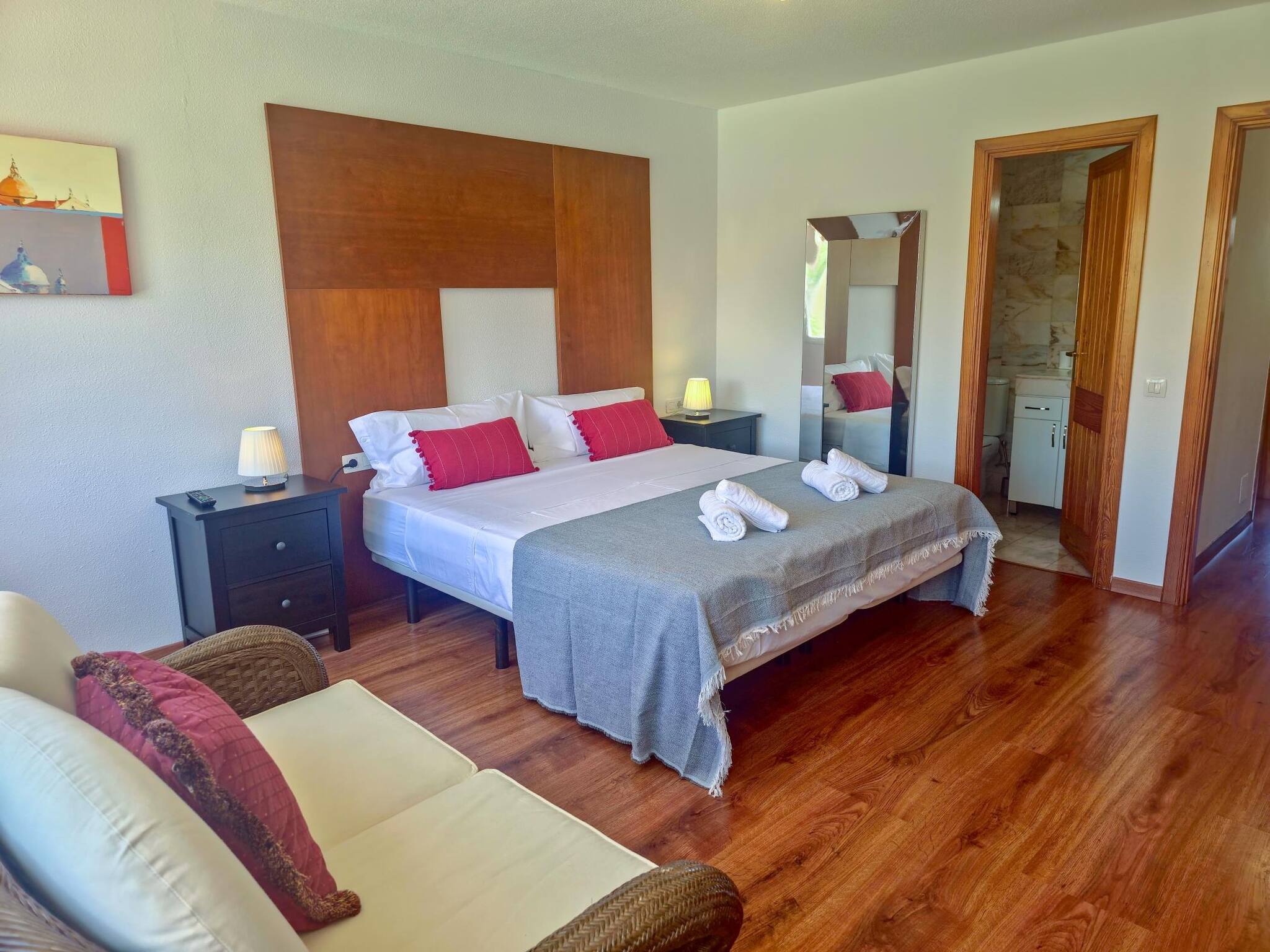 En tercera planta una amplia habitación con cama de 150 y baño completo privado. Las 2 habitaciones de matrimonio tienen vista al jardín y a la piscina del complejo.