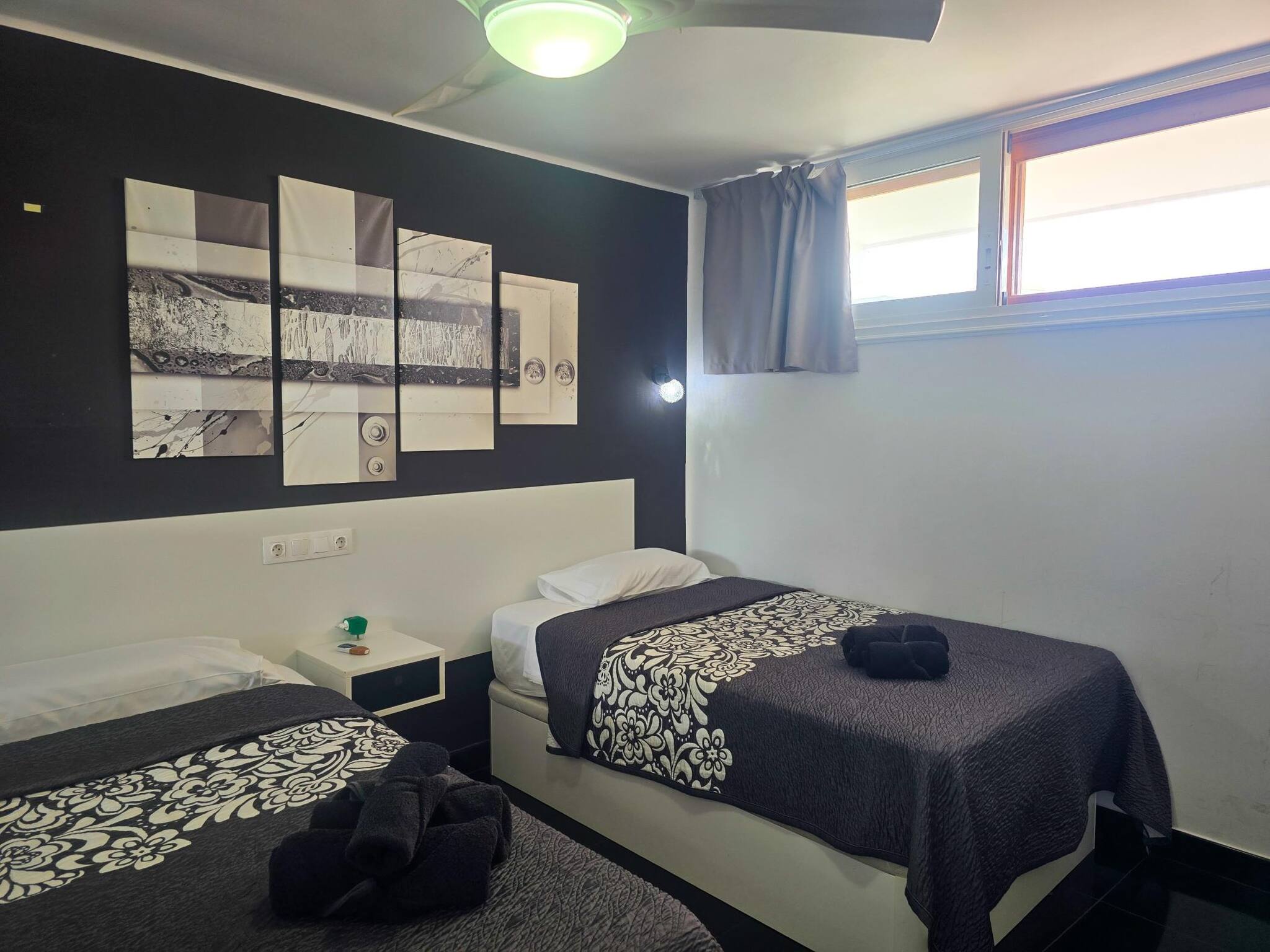 C'est un appartement d'une chambre, avec 2 lits individuels, et un grand salon avec cuisine américaine. La salle de bain dispose d'une douche.