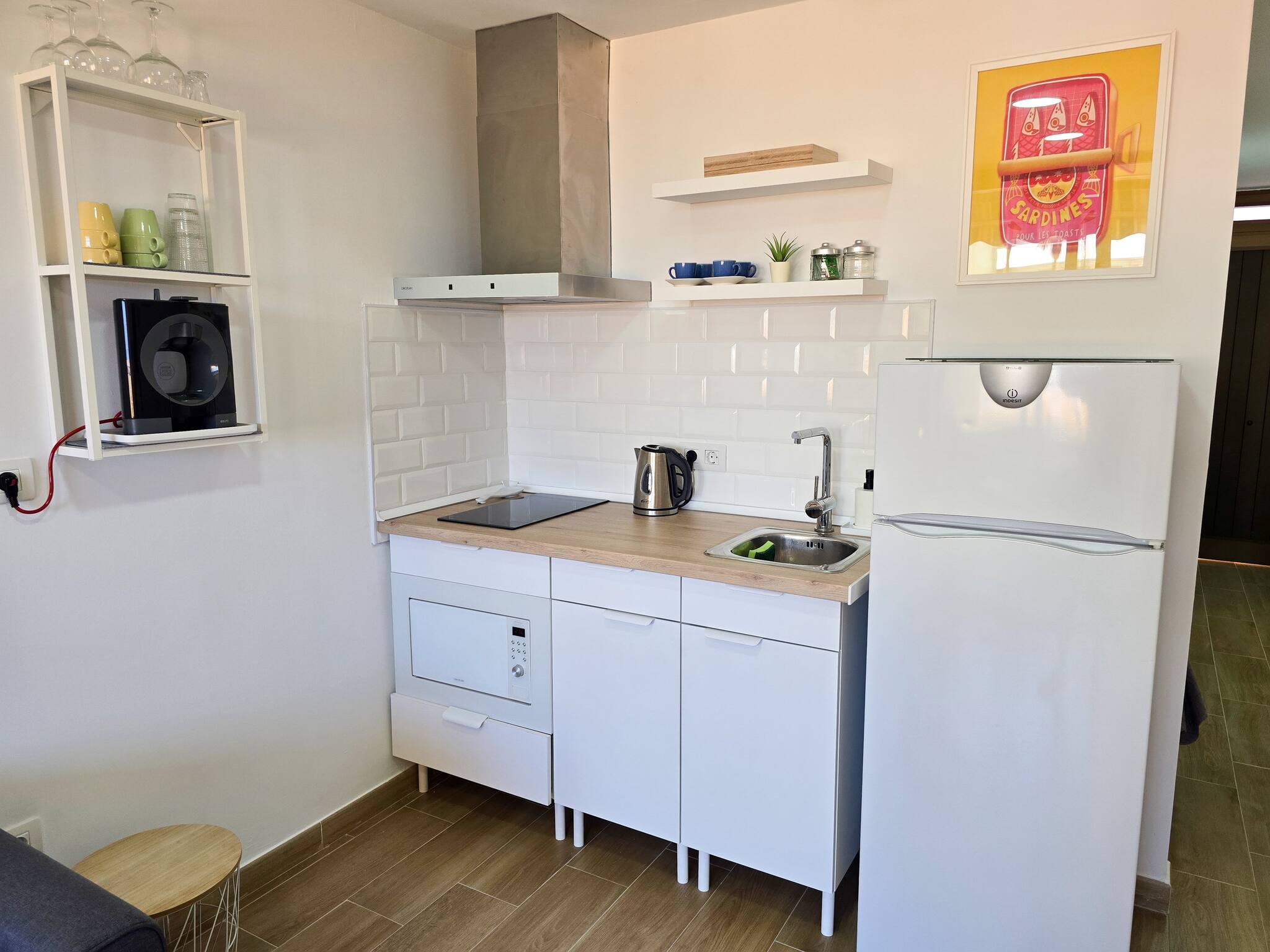 Le logementse compose d'un espace avec une kitchenette, un canapé et un lit double.