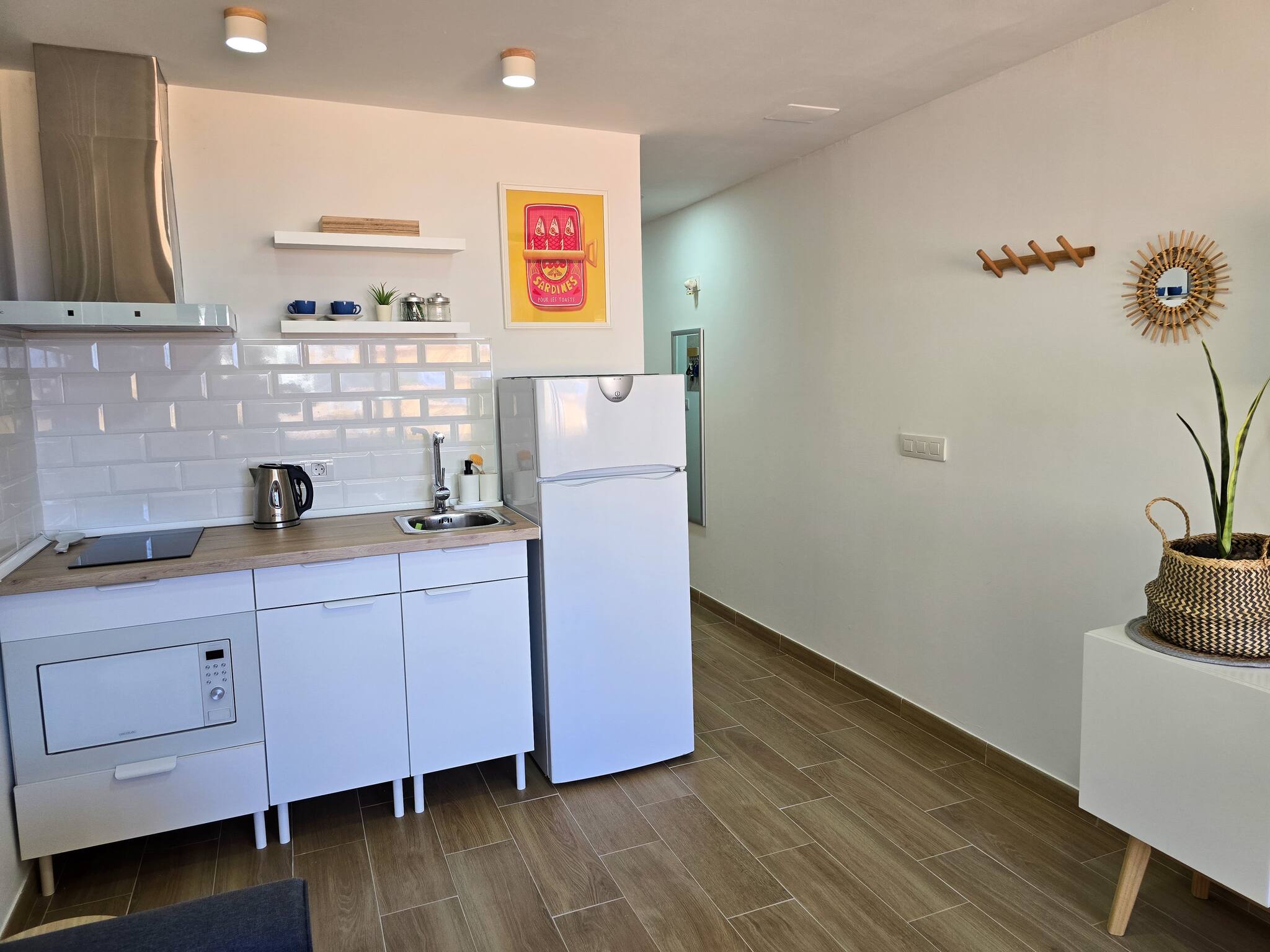 O alojamento local é composto por um espaço amplo com ‘kitchenette’, sofá e cama de casal, tudo decorado com muito bom gosto. Tem uma casa de banho com chuveiro e máquina de lavar. E um belo terraço com um pequeno sofá, mesa e cadeiras, onde pode desfrutar de vistas para a piscina e para o mar, com toda a tranquilidade.