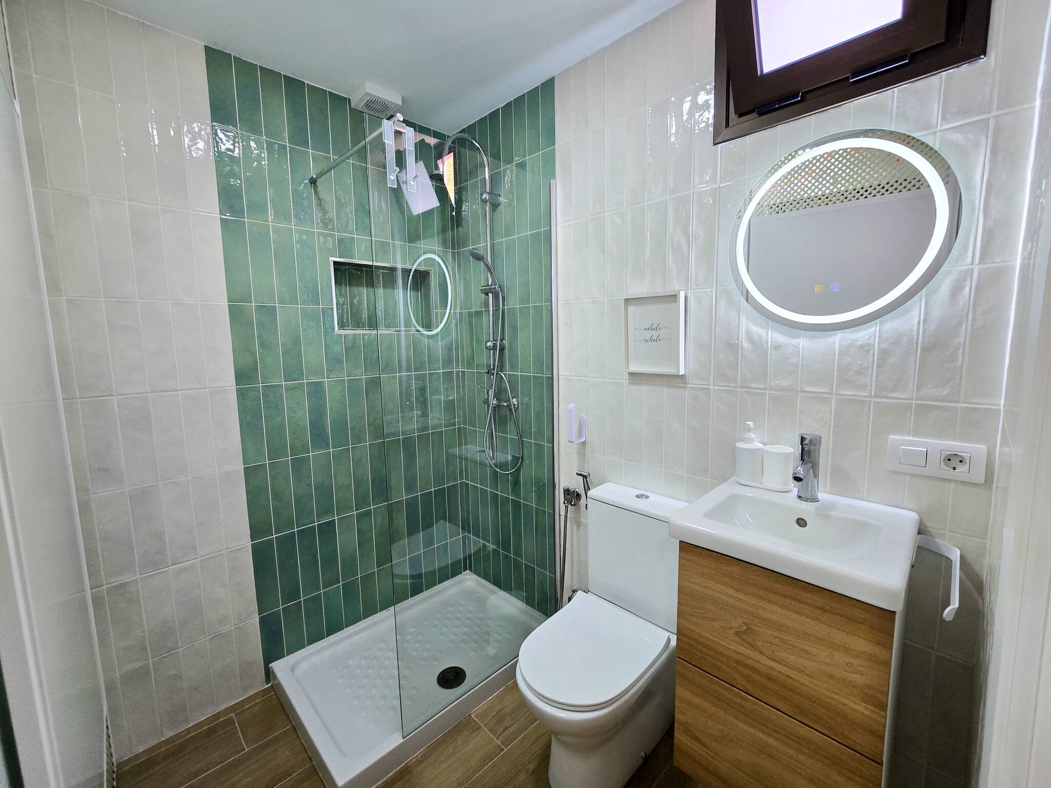 Tem uma casa-de-banho com chuveiro e máquina de lavar. E uma varanda com mesa e cadeiras, onde você pode desfrutar de uma vista para a piscina e para o mar, com toda a tranquilidade.
