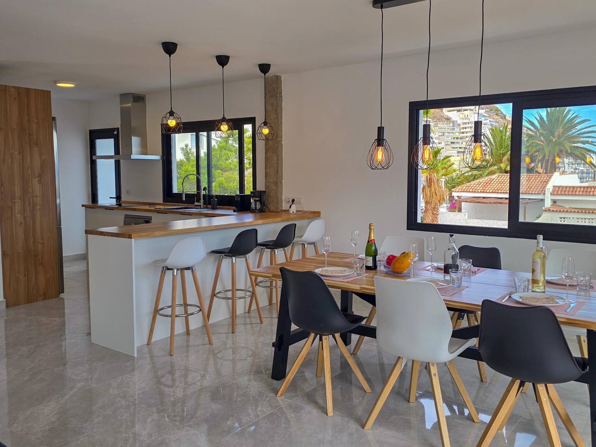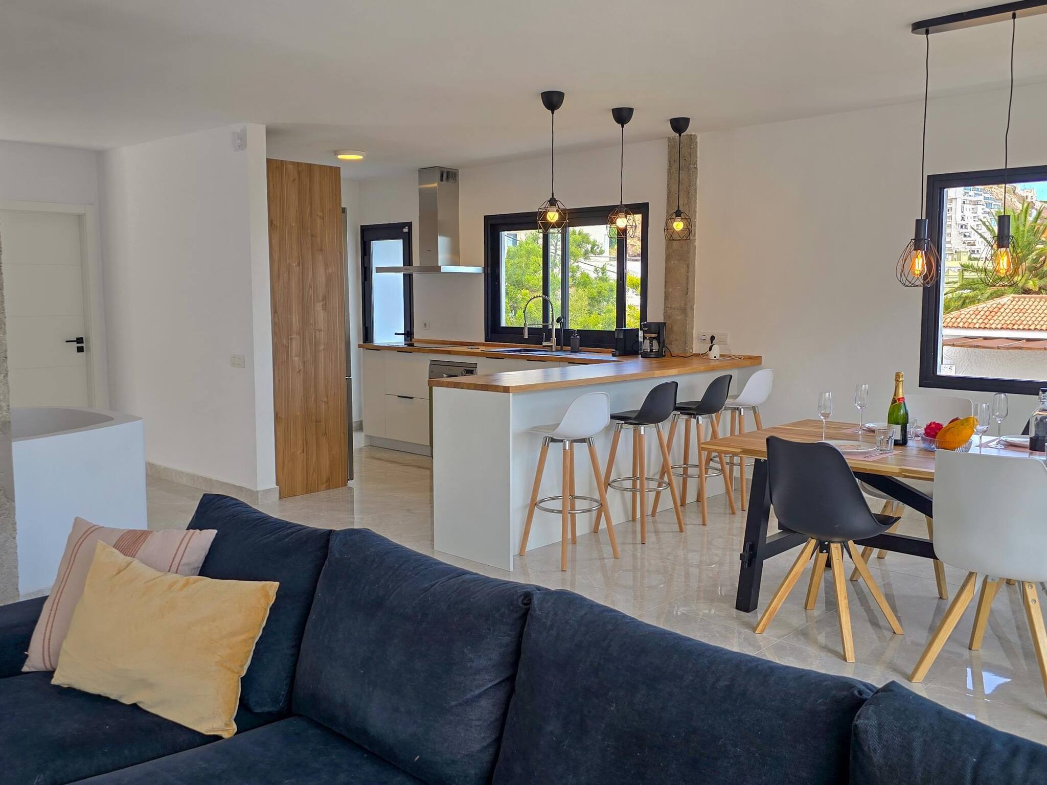 No piso superior, encontra-se uma cozinha totalmente equipada em conceito aberto, integrada numa espaçosa sala de estar e jantar. A partir daqui, acede-se a um terraço com vistas espetaculares sobre o mar, perfeito para desfrutar do pequeno-almoço com o nascer do sol ou de uma bebida ao pôr do sol.